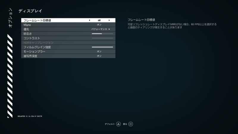 PS5でもゲーム内設定のディスプレイ項目からフレームレートやグラフィック品質の設定ができます。